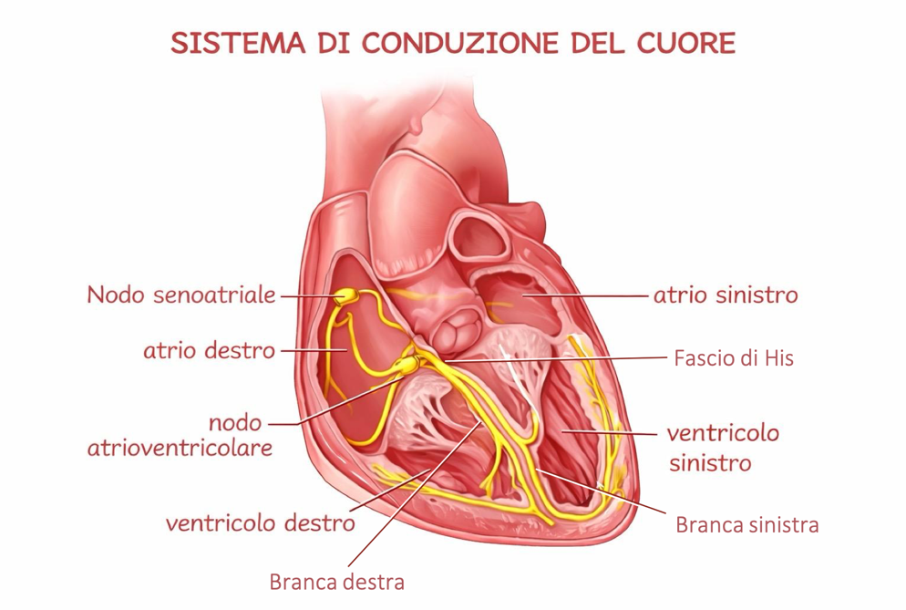 Il cuore è un muscolo in grado di pompare il sangue a tutti i distretti del corpo attraverso la contrazione delle sue fibre. È dotato di un “impianto elettrico” interno che permette di distribuire il “comando” alla contrazione delle fibre muscolari cardiache in modo coerente ed efficiente, attraverso vere e proprie “autostrade elettriche”. Normalmente l’impulso elettrico nasce in alto, negli atri, e passa ai ventricoli attraverso una struttura chiave, il nodo atrio-ventricolare, per poi correre lungo uno “snodo principale” chiamato fascio di His e dividersi in branca destra e branca sinistra, che si occupano di far contrarre rispettivamente il ventricolo destro e il ventricolo sinistro.